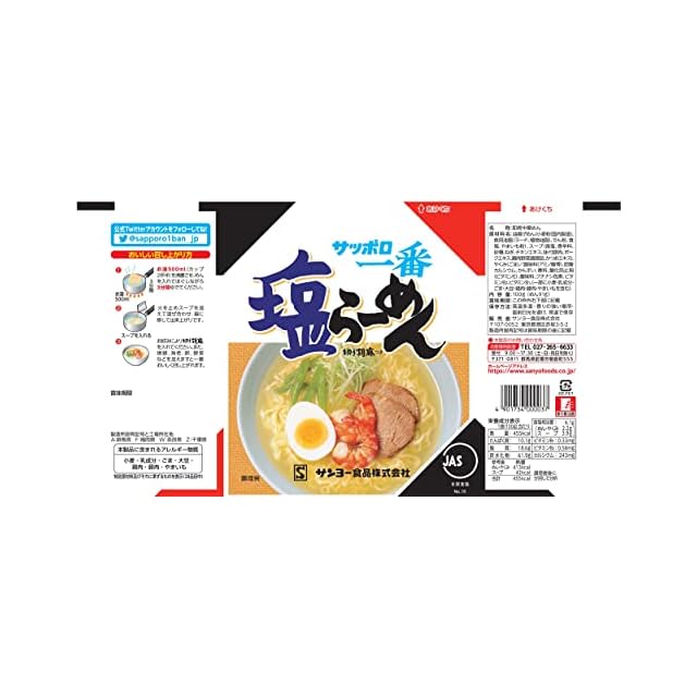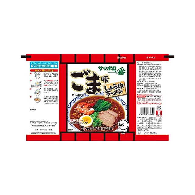 原材料:しょうゆ:油揚げめん(小麦粉(国内製造)、食用油脂(ラード、植物油脂)、でん粉、しょうゆ、食塩)、スープ(食塩、糖類、しょうゆ、香辛料、ねぎ、チキンエキス、植物油脂)、やくみ(香辛料、糖類)/調味料(アミノ酸等)、炭酸カルシウム、カラメル色素、増粘多糖類、かんすい、酸化防止剤(ビタミンE)、酸味料、ビタミンB2、ビタミンB1、(一部に小麦・ごま・大豆・鶏肉を含む)みそ:油揚げめん(小麦粉(国内製造)、食用油脂(ラード、植物油脂)、でん粉、食塩、しょうゆ、みそ)、スープ(みそ、食塩、香辛料、糖類、ポークエキス、ねぎ、かつおエキス、酵母エキス、発酵調味料)、やくみ(七味唐辛子)/調味料(アミノ酸等)、炭酸カルシウム、かんすい、カラメル色素、増粘多糖類、香辛料抽出物、クチナシ色素、酸化防止剤(ビタミンE)、酸味料、ビタミンB2、ビタミンB1、(一部に小麦・乳成分・ごま・大豆・鶏肉・豚肉を含む)塩:油揚げめん(小麦粉(国内製造)、食用油脂(ラード、植物油脂)、でん粉、食塩、やまいも粉)、スープ(食塩、香辛料、糖類、ねぎ、チキンエキス、味付豚肉、ポークエキス、鶏肉野菜調理品、かつおエキス)、やくみ(ごま)/調味料(アミノ酸等)、炭酸カルシウム、かんすい、香料、酸化防止剤(ビタミンE)、酸味料、クチナシ色素、ビタミンB2、ビタミンB1、(一部に小麦・乳成分・ごま・大豆・鶏肉・豚肉・やまいもを含む)ごま:油揚げめん(小麦粉(国内製造)、食用油脂(ラード、植物油脂)、でん粉、しょうゆ、食塩)、スープ(しょうゆ、食塩、植物油脂、ごま、香辛料、糖類、ねぎ、チキンエキス、デキストリン)、やくみ(ごま)/調味料(アミノ酸等)、炭酸カルシウム、カラメル色素、増粘多糖類、かんすい、酸化防止剤(ビタミンE)、酸味料、ビタミンB2、ビタミンB1、(一部に小麦・ごま・大豆・鶏肉を含む)