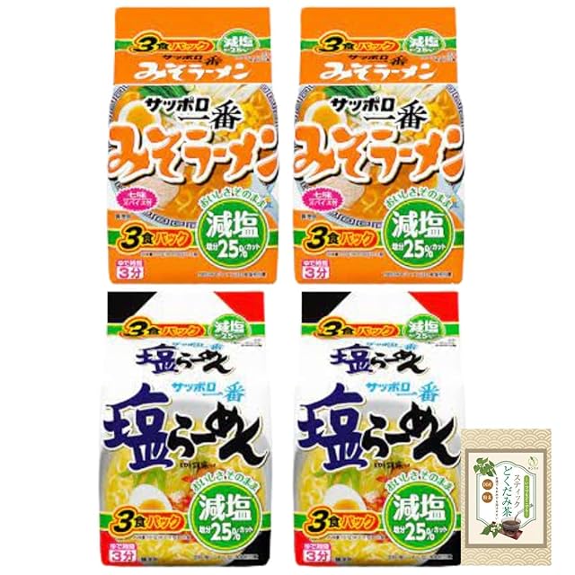 ★サッポロ一番 減塩 塩らーめん 3食パック<br><br> おいしさそのまま「減塩 塩分25%カット」の「サッポロ一番 塩らーめん」です。<br> 「サッポロ一番 塩らーめん」のめんの塩分を調整しためんです。しなやかで歯応えのあるめんです。形状を丸型とし、滑らかでのど越しのよいめんに仕上げました。<br> 「サッポロ一番 塩らーめん」スープの塩分を調整したスープです。チキンとポークのうまみをベースに、塩味を引き立たせながらオニオン、ガーリックの香味野菜、香辛料をバランスよく配合したスープです。<br> 別添「切り胡麻」付きです。<br><br> ★サッポロ一番 減塩 みそラーメン 3食パック<br><br> おいしさそのまま「減塩 塩分25%カット」の「サッポロ一番 みそラーメン」です。<br> 「サッポロ一番 みそラーメン」のめんの塩分を調整しためんです。断面を楕円型にすることで、もちっと歯応えのある食感に仕上げました。スープとなじみをよくするため、めんにみそを練り込みました。<br> 「サッポロ一番 みそラーメン」スープの塩分を調整したスープです。特徴のある数種のみそを絶妙にブレンドしてジンジャー、ガーリックをきかせ、ポークのうまみで味に厚みを出したスープです。<br> 別添「七味スパイス」付きです。