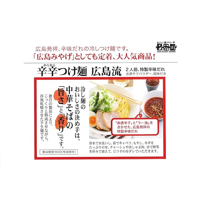 【辛辛つけ麺広島流】<br> 広島発祥のつけ麺として、人気の高い商品です。<br> 広島のお土産にご家庭用にどうぞ。<br> 広島つけ麺の特徴は、ピリリと辛い赤だれにあります。<br> この辛さと旨味が調和された絶品のたれと、一昼夜じっくり熟成させて冷風乾燥させた半生中華麺お召し上がり下さい。<br> <br> 内容量:〔めん〕100g×8、〔たれ〕80g×8、〔具(赤唐辛子・胡麻)〕3g×8<br> 賞味期限:90日<br> 保存方法:直射日光、高温多湿を避け、保存してください。<br> 使用上の注意:開封後はお早めにお召し上がりください。<br>