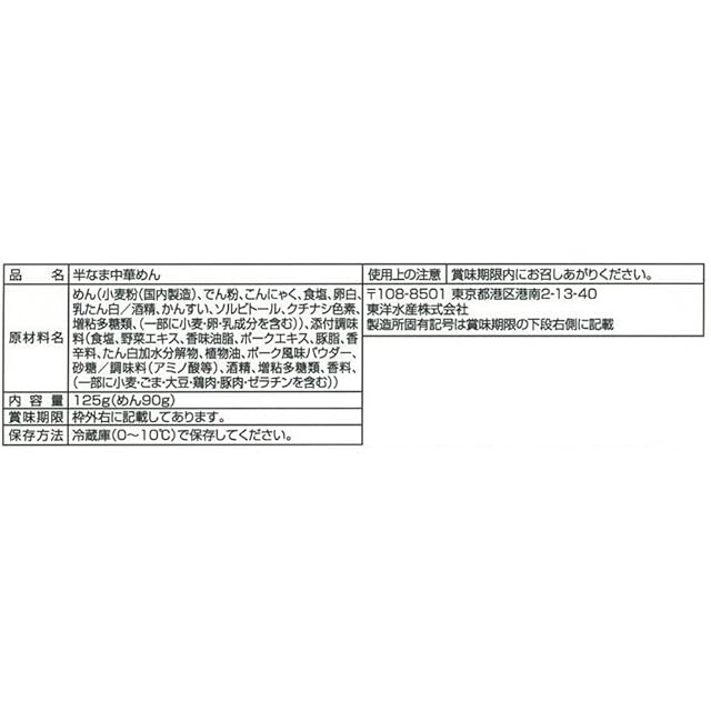 原材料:めん(小麦粉(国内製造)、でん粉、こんにゃく、食塩、卵白、乳たん白/酒精、かんすい、ソルビトール、クチナシ色素、増粘多糖類、(一部に小麦・卵・乳成分を含む))、添付調味料(食塩、野菜エキス、香味油脂、ポークエキス、豚脂、香辛料、たん白加水分解物、植物油、ポーク風味パウダー、砂糖/調味料(アミノ酸等)、酒精、増粘多糖類、香料、(一部に小麦・ごま・大豆・鶏肉・豚肉・ゼラチンを含む))