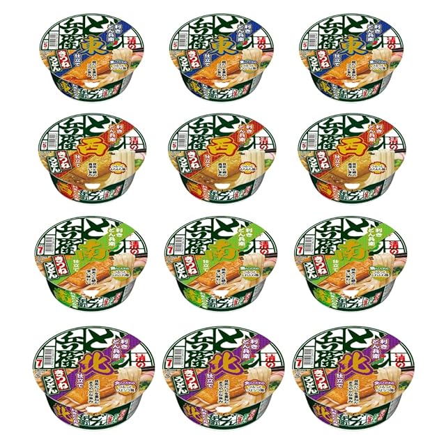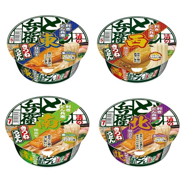 利きどん兵衛 きつねうどん 東 [鰹だしを重ねたコクと旨み] &利きどん兵衛 きつねうどん 西 [昆布と鰹の奥深い旨み] &利きどん兵衛 きつねうどん 南 [焼あごと鯖の深い味わい]&利きどん兵衛 きつねうどん 北 [昆布だしを重ねたまろやかな旨み] 各3個計12個セットの期間限定の商品になります。
