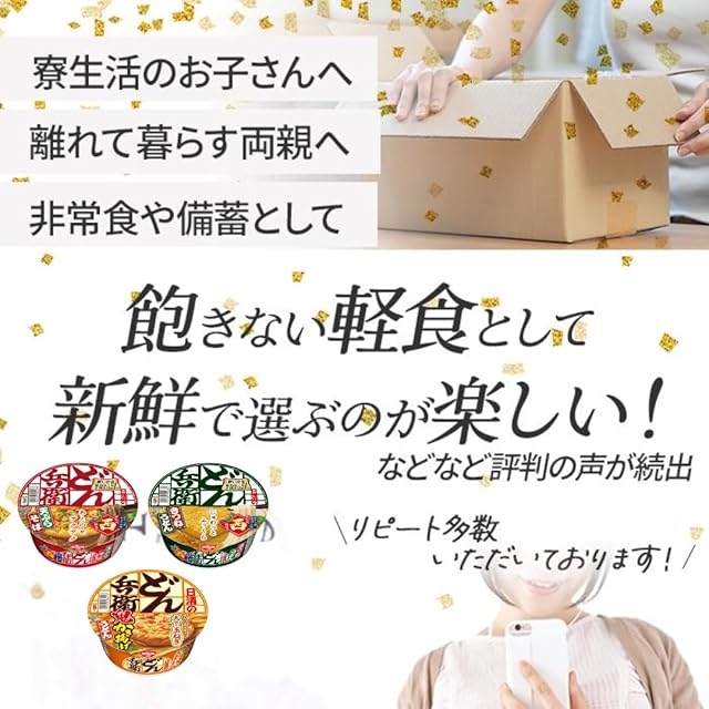 日清食品のどん兵衛、きつねうどん・天ぷらそば・かき揚げ天ぷらうどん、3種類を各4食ずつ、12食セットにしてお届けいたします。 <br> お得なカップ麺の詰め合わせです。<br> <br> <br> <br> 【商品説明】<br> <br> 「日清のどん兵衛 きつねうどん [西]」<br> <西日本向け>丸大豆醤油の旨みと、本鰹と昆布のWだしが上品に調和した、だしのうまみが後を引く味わい深いつゆに、豆腐屋さんと同じ製法で作った丸大豆100%のふっくらおあげが特長のきつねうどん。<br> <br> <br> 「原材料名」<br> 油揚げめん(小麦粉(国内製造)、植物油脂、食塩、植物性たん白、こんぶエキス、大豆食物繊維、糖類)、かやく(味付油揚げ、かまぼこ)、スープ(食塩、魚介調味料、粉末しょうゆ、魚粉(かつお、さば、いわし)、七味唐辛子、ねぎ、糖類、こんぶ粉末、こんぶ調味料)/加工でん粉、調味料(アミノ酸等)、増粘剤(アラビアガム)、炭酸Ca、リン酸塩(Na)、カラメル色素、香料、酸化防止剤(ビタミンE)、香辛料抽出物、乳化剤、パプリカ色素、クチナシ色素、ビタミンB2、チャ抽出物、ビタミンB1、ベニコウジ色素、(一部に小麦・乳成分・ごま・さば・大豆・ゼラチンを含む)<br> <br> <br> <br> <br> 「日清のどん兵衛 天ぷらそば [西]」<br> <西日本向け>丸大豆醤油の旨みと、本鰹と昆布のWだしが上品に調和した、だしのうまみが後を引く味わい深いつゆに、あとのせサクサク天ぷらが入った天ぷらそば。<br> <br> <br> 「原材料名」<br> 油揚げめん(小麦粉(国内製造)、そば粉、植物油脂、食塩、植物性たん白、しょうゆ、かつおぶし粉末、糖類)、かやく(天ぷら)、スープ(糖類、食塩、かつおぶし調味料、粉末しょうゆ、かつおぶし粉末、ねぎ、七味唐辛子、たん白加水分解物、こんぶ粉末、こんぶ調味料)/加工でん粉、調味料(アミノ酸等)、リン酸塩(Na)、炭酸Ca、カラメル色素、香料、酸化防止剤(ビタミンE)、カロチノイド色素、ベニコウジ色素、チャ抽出物、ビタミンB2、ビタミンB1、(一部にえび・小麦・そば・卵・乳成分・ごま・大豆を含む)<br> <br> <br> <br> <br> 「日清のどん兵衛 かき揚げ天ぷらうどん」<br> 食べごたえのある鬼かき揚げうどん<br> かつおの香りと旨みがきいたつゆに、食べごたえのある“鬼かき揚げ”が特徴のうどんです。たっぷり玉ねぎのど厚いかき揚げはボリュームがあり、まさに「鬼うまい」一品です。<br> <br> <br> 「原材料名」<br> 油揚げめん(小麦粉、植物油脂、食塩、植物性たん白、昆布エキス、大豆食物繊維、糖類)、かやく(かき揚げ)、スープ(食塩、糖類、粉末しょうゆ、魚粉、魚介調味料、香辛料、ねぎ、たん白加水分解物)/加工でん粉、調味料(アミノ酸等)、増粘剤(アラビアガム)、炭酸Ca、リン酸塩(Na)、カラメル色素、香料、酸化防止剤(ビタミンE)、乳化剤、カロチノイド色素、ビタミンB2、ベニコウジ色素、ビタミンB1、(一部にえび・小麦・卵・乳成分・大豆を含む)<br><br>