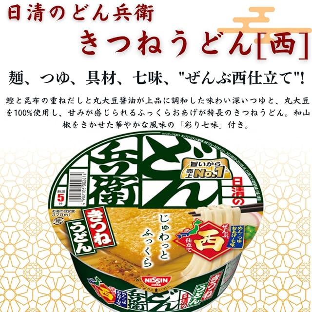 ✅「日清のどん兵衛 きつねうどん [西]」 <西日本向け>丸大豆醤油の旨みと、本鰹と昆布のWだしが上品に調和した、だしのうまみが後を引く味わい深いつゆに、豆腐屋さんと同じ製法で作った丸大豆100%のふっくらおあげが特長のきつねうどん。