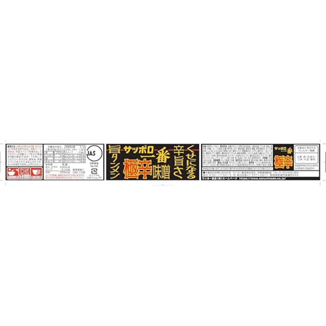 原材料名:油揚げめん(小麦粉(国内製造)、植物油脂、でん粉、食塩、粉末卵、砂糖)、スープ(食塩、砂糖、香辛料、みそ、植物油脂、香味油、豚脂、野菜調味料、ポーク調味料、しょうゆ、たん白加水分解物、ねぎ、酵母エキス、発酵調味料)、かやく(唐辛子)/加工でん粉、調味料(アミノ酸等)、増粘剤(加工でん粉、増粘多糖類)、カラメル色素、炭酸カルシウム、香料、クチナシ色素、香辛料抽出物、かんすい、甘味料(カンゾウ)、酸化防止剤(ビタミンE)、酸味料、ビタミンB2、ビタミンB1、(一部に小麦・卵・乳成分・ごま・大豆・豚肉を含む)