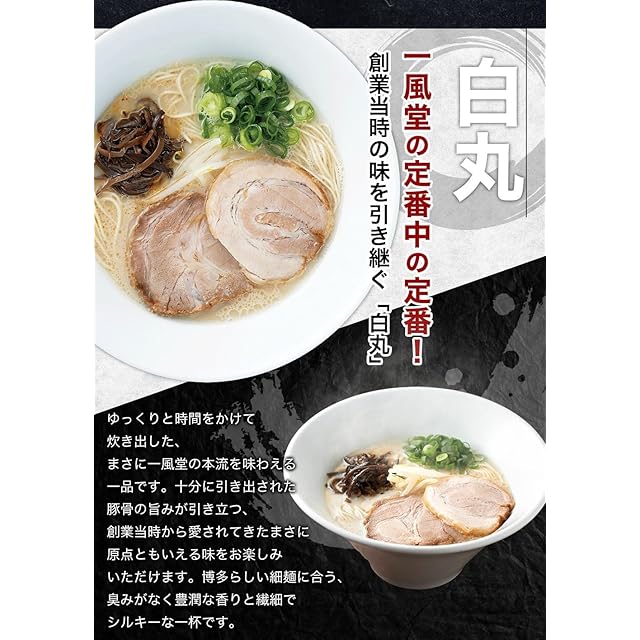 "一風堂の博多・絹ごしとんこつラーメン白丸・赤丸は、一風堂の人気メニューであるとんこつラーメンを自宅で手軽に楽しめる商品です。 おうちでIPPUDO 豚骨ラーメンは、一風堂の特製スープと特製麺を使用し、本格的な味わいを再現しています。 ラーメンスープとインスタント麺がセットになっており、簡単に調理できるため、忙しい日や食事の準備が面倒な時に便利です。 保存食としても優れており、常温で長期保存が可能なので、非常時や災害時にも役立ちます。 味付けや具材はバランスよく調整されており、一風堂のラーメンをそのまま楽しめる美味しさが特徴です。"