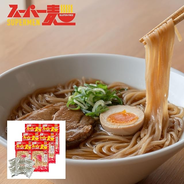 【待望のスープ付きスーパー麺】<br> グルテンフリー玄米麺に、待望のスープ付きが誕生!<br> 麺だけでなく、スープにも小麦不使用、ヘルシーでおいしいラーメンを60秒でお楽しみいただけます。<br><br> 【スーパー麺】<br> 国産玄米と北海道産ばれいしょでん粉のみを使ったグルテンフリー麺。<br> 食べるほどに強くなる玄米由来の豊富なミネラルと、独自製法で生パスタのような「つるモチ」食感を実現しました。<br>アミノ酸などの化学調味料・保存料・着色料は使っていません。<br><br> 【スーパーたまりしょうゆスープ】<br> 原料の大豆を蒸して麹を加え、できた味噌玉を1年間以上発酵させて作られる醤油のこと。<br> 伝統的製法のたまり醤油を贅沢に使ったラーメンスープ<br> <br> 【鍋ひとつで簡単調理】<br> お湯を沸かして60秒ゆでて完成。<br> エネルギーと時間を節約をしつつ、グルテンフリーのたまり醤油ラーメンスープと一緒にお楽しみください。<br> 6食入り。<br><br> 【賞味期限】<br> 常温保存で製造から1年<br> 【栄養成分表示】<br> 製品1食当たり(めん100g、スープ39g) <br> エネルギー 292kcal たんぱく質 6.7g 脂質 3.0g 炭水化物 58.6g-糖質 57.3g-食物繊維 1.3g 食塩相当量 4.9g 亜鉛 1.2mg カリウム 190.0mg 鉄 1.3mg マグネシウム 23.9mg <br> 【原材料名】<br> 【玄米麺】玄米(国産)、馬鈴薯でん粉(馬鈴薯(北海道産))<br> 【スープ】清酒(国内製造)、食塩、たまりしょうゆ、ポークエキス、ごま油、チキンエキス、酵母エキス、てんさい糖、香辛料、米黒酢、(一部に大豆、豚肉、鶏肉、ごまを含む) <br> 【アレルギー情報】大豆・鶏肉・豚肉・ごま。スープ製造工場では、小麦、えび、かに、乳製品を含む製品を製造しています。<br>