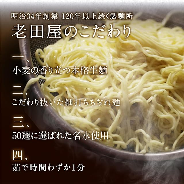 「高山ラーメン」の名付け親である、老田屋がこだわって製麺しております。麺の練り水は岐阜県名水50選に選ばれた「飛騨神岡大洞湧水群」。さらに地酒を練りこみ、保存料不使用でも長期保存を可能にした独自製麺。