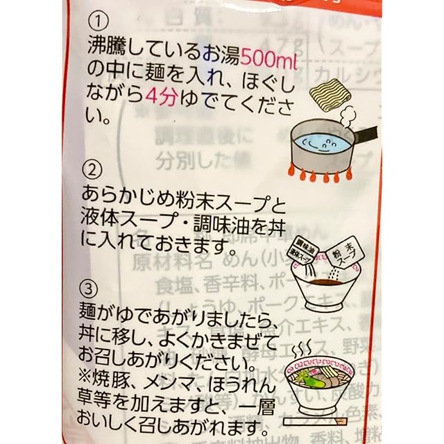 原材料・成分 めん(小麦粉、でん粉、食塩、香辛料、ポークエキス)、添付調味料(醤油、ポークエキス、豚脂、チキンエキス、食塩、魚介エキス、香味油脂、植物油、砂糖、酵母エキス、野菜エキス、香辛料、たん白加水分解物、ねぎ)、調味料(アミノ酸等)、かんすい、炭酸カルシウム、レシチン、酒精、カラメル色素、クチナシ色素、香辛料抽出物、香料、増粘多糖類、(原材料の一部に卵、乳成分、ごま、りんごを含む)