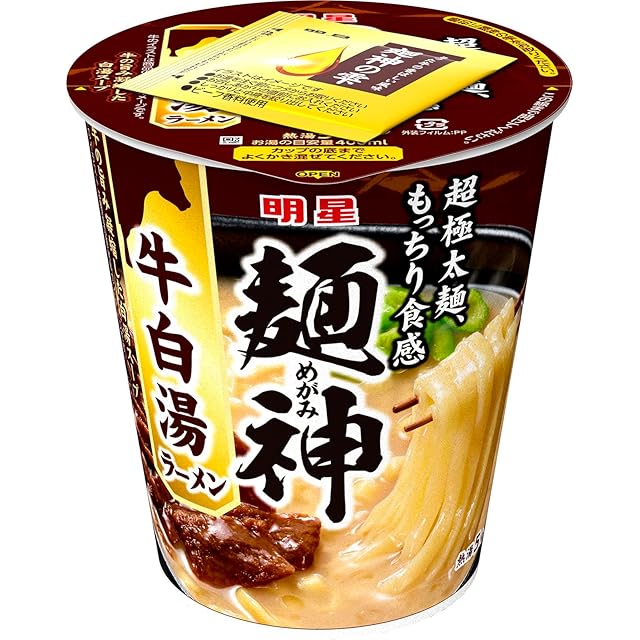 明星 麺神(めがみ)カップ 牛白湯ラーメン[生めん風3層極太製法、牛の旨み凝縮した白湯スープ、炙った牛の香ばしい風味、12個入]