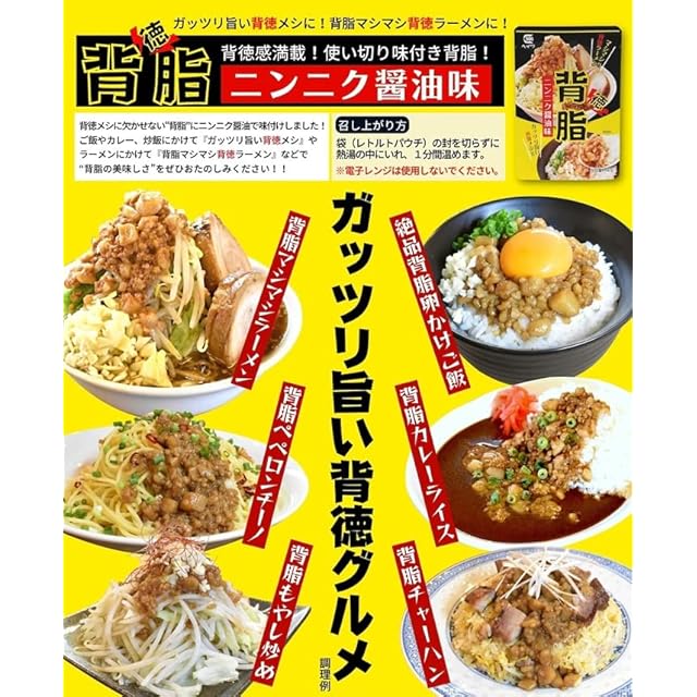 <b>ガッツリうまい背徳メシ</b><br> 背徳メシに欠かせない“背脂”をニンニク醤油で味付けしました!<br> ご飯やカレー、炒飯にかけて『ガッツリ旨い背徳メシ』やラーメンにかけて『背脂マシマシ背徳ラーメン』などで“背脂の美味しさ”をぜひおたのしみください。<br> <br><br> ■使用方法<br> 袋 (レトルトパウチ) の封を切らずに熱湯の中に入れ、1分間温めます。<br> <br> ※電子レンジは使用しないでください。<br>