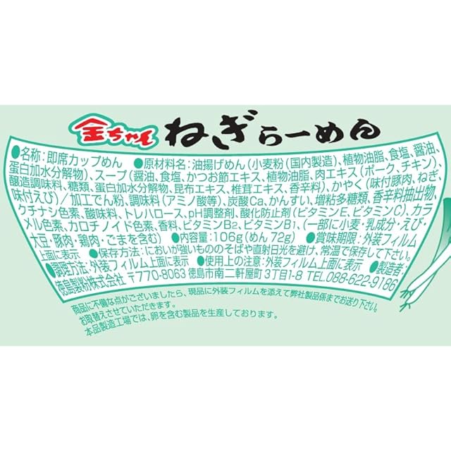 原材料:油揚げめん(小麦粉(国内製造)、植物油脂、食塩、醤油、蛋白加水分解物)、スープ(醤油、食塩、かつお節エキス、植物油脂、肉エキス(ポーク、チキン)、醸造調味料、糖類、蛋白加水分解物、昆布エキス、椎茸エキス、香辛料)、かやく(味付豚肉、ねぎ、味付えび)/加工でん粉、調味料(アミノ酸等)、炭酸Ca、かんすい、増粘多糖類、香辛料抽出物、クチナシ色素、酸味料、トレハロース、pH調整剤、酸化防止剤(ビタミンE、ビタミンC)、カラメル色素、カロチノイド色素、香料、ビタミンB2、ビタミンB1、(一部に小麦・乳成分・えび・大豆・豚肉・鶏肉・ごまを含む)