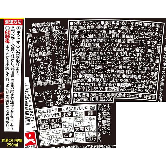 1食(66g)当たり熱量:266kcal、たんぱく質:9.3g、脂質:7.0g、炭水化物:41.4g、食塩相当量:4.0g(めん・かやく:1.3g、スープ:2.7g)、ビタミンB1:0.20mg、ビタミンB2:0.23mg、カルシウム:162mg