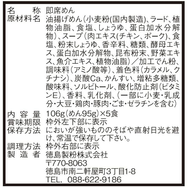 原材料:油揚げめん(小麦粉(国内製造)、ラード、植物油脂、食塩、しょうゆ、蛋白加水分解物)、スープ(肉エキス(チキン、ポーク)、食塩、粉末しょうゆ、香辛料、糖類、酵母エキス、蛋白加水分解物、昆布粉末、野菜エキス、魚介エキス、植物油脂)/加工でん粉、調味料(アミノ酸等)、着色料(カラメル、クチナシ)、炭酸Ca、かんすい、増粘多糖類、酸味料、ソルビトール、酸化防止剤(ビタミンE)、香料、乳化剤、(一部に小麦・乳成分・大豆・鶏肉・豚肉・ごま・ゼラチンを含む)