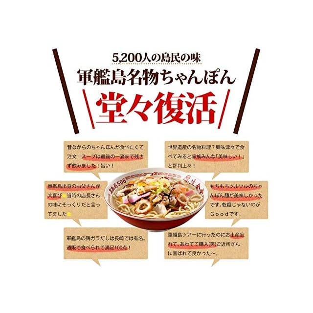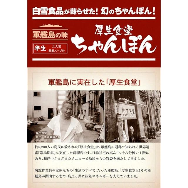 長崎市端島「軍艦島」は、2015年に世界文化遺産に登録されました。<br> 炭鉱の島として最盛期多くの住民の胃袋を満たした厚生食堂。その中でもちゃんぽんは一番の人気だったとか。<br> 鶏がらベースのだしで、昔懐かしいちゃんぽんになりました。<br> <br> 内容量(1箱あたり):405g(麺:100g×3、スープ35g×3)<br> 原材料:【めん】小麦粉、食塩/かんすい(唐あく水)、酒精、ソルビトール、プロピレングリコール<br> 【スープ】アミノ酸液(大豆を含む)、食塩、チキンエキス(還元水飴、チキンエキス、食塩、その他)(鶏肉を含む)、砂糖、畜肉エキス(豚肉・鶏肉・大豆を含む)、酵母エキス、オニオンパウダー、香辛料/アルコール、調味料(アミノ酸等)、増粘剤(キサンタンガム)、ビタミンB1<br> 保存方法:直射日光を避け、冷暗所に保存して下さい。<br> ※北海道、沖縄、離島は別途送料がかかります。