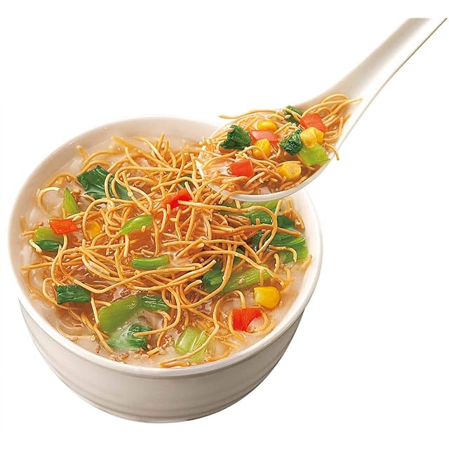 具入り粉末スープ・袋入りパリパリ揚げ麺入り ※パリパリ揚げ麺の袋にあいている穴は空気穴です。