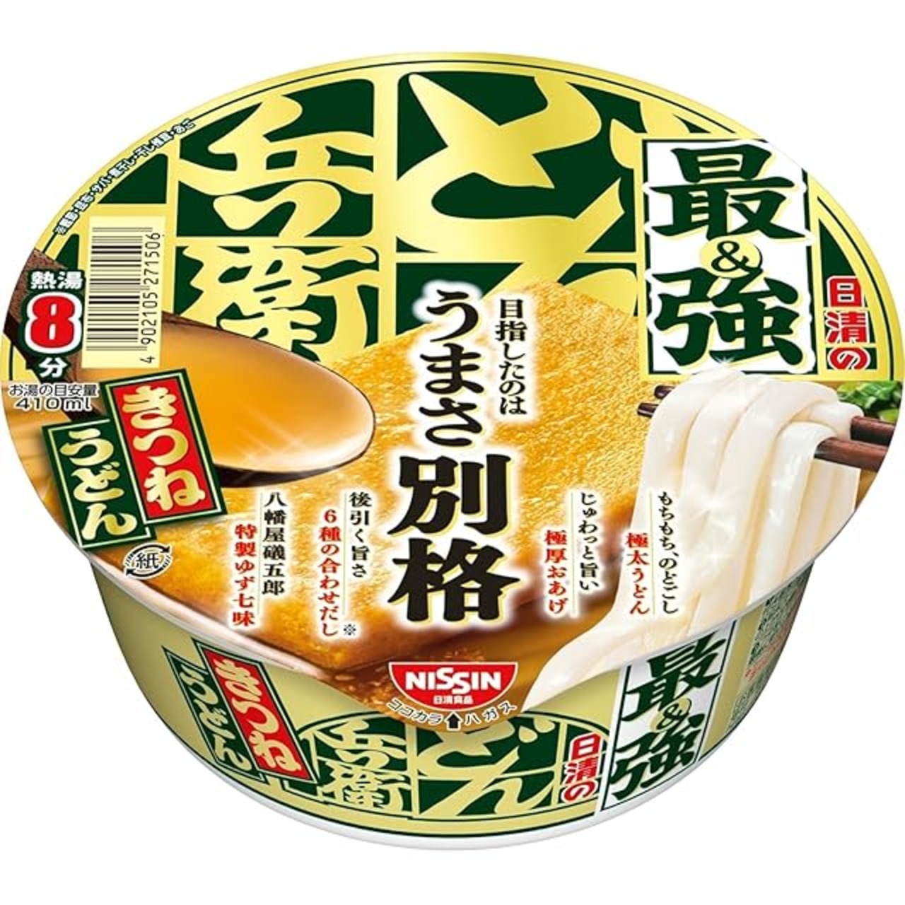 全てが主役!日清の最強どん兵衛 麺はどん兵衛きつねうどんよりさらに太くもちもちした麺、だしは昆布の後引きが特長の6種の合わせだし、きつねうどんよりさらにぶ厚いお揚げ、長野の八幡屋磯五郎のゆず七味が入った、全てが主役の最強どん兵衛。 原材料・成分 油揚げめん(小麦粉(国内製造)、植物油脂、食塩、植物性たん白、大豆食物繊維)、かやく(味付油揚げ、かまぼこ)、スープ(食塩、糖類、粉末しょうゆ、かつおぶし調味料、魚粉(かつお、さば、あご)、にぼし調味料、七味唐辛子、ねぎ、こんぶ調味料、こんぶ粉末、しいたけ調味料)/加工でん粉、調味料(アミノ酸等)、増粘剤(アラビアガム)、リン酸塩(Na)、炭酸Ca、カラメル色素、香料、pH調整剤、酸化防止剤(ビタミンE)、香辛料抽出物、乳化剤、パプリカ色素、クチナシ色素、チャ抽出物、ビタミンB2、ビタミンB1、ベニコウジ色素、(一部に小麦・乳成分・ごま・さば・大豆・ゼラチンを含む) 使用方法 【1】フタを半分まではがし、七味付き粉末スープの袋を取り出す。【2】粉末スープを先に入れ、熱湯をあげの上から内側の線までゆっくり注ぐ。【3】フタをして8分後、軽くまぜる。最後に七味をかけてできあがり。
