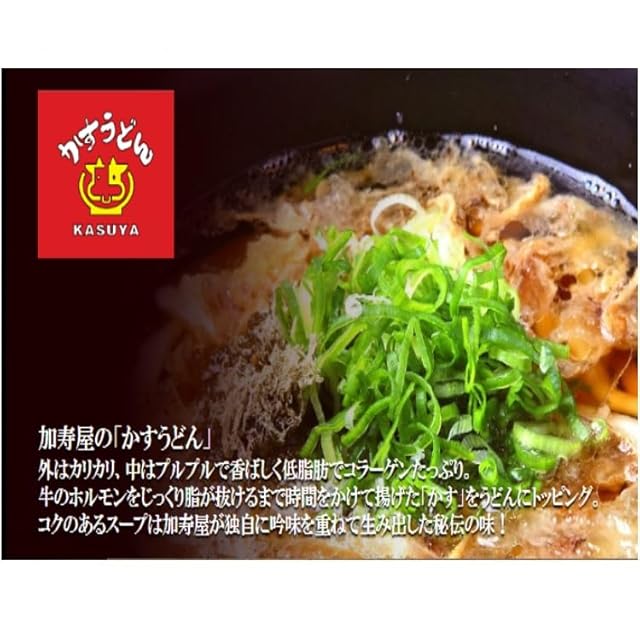 外はカリカリ、中はプルプルで香ばしく低脂肪でコラーゲンたっぷり。 牛のホルモンをじっくり脂が抜けるまで時間をかけて揚げた「かす」をうどんにトッピング。 コクのあるスープは加寿屋が独自に吟味を重ねて生み出した秘伝の味! ◆かすうどん 2人前×2箱 (4人前)