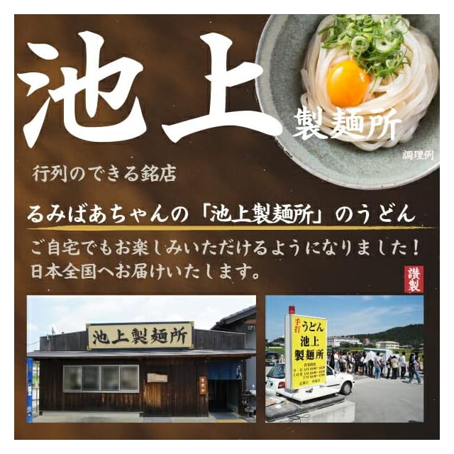 商品説明 800店舗をこえるうどん屋がひしめき合う香川県の中でもアイドル的存在のるみおばあちゃん。 昭和32年創業から長らく讃岐人に愛される「池上製麺所」がるみおばあちゃんのお店です。 昔ながらの製法を守り、すべて手作業で仕込むうどんは。 もっちりと弾力のあるコシの強さとツルツルとした喉越しのよさが自慢。 独特なコシと、噛めば噛むほどにじみ出てくる小麦粉の味。 愛情をこめた手作り製法だからこそ、1本1本の麺が生き生きとした輝きを見せてくれます。 創業以来変わらない、長年愛され続ける讃岐のおいしさをお届けいたします。