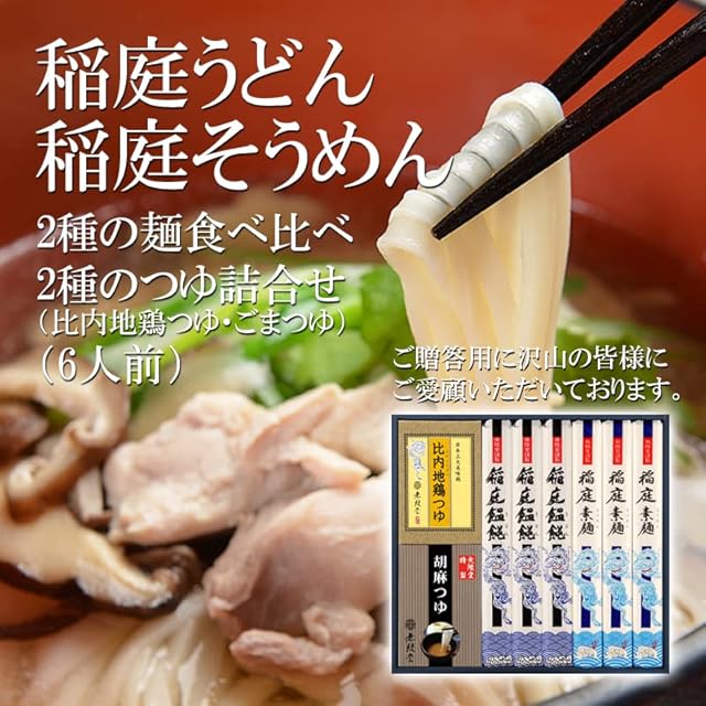◯内容量:稲庭うどん80g×3、稲庭そうめん80g×3比内地鶏つゆ34g×3、胡麻つゆ30g×3◯原材料:稲庭うどん(小麦粉(国内製造)、食塩、でんぷん(打ち粉として使用))、稲庭そうめん(小麦粉(国内製造)、食塩、でんぷん(打ち粉として使用))、比内地鶏つゆ(しょうゆ(国内製造)、砂糖、食塩、チキンエキス、たん白加水分解物、発酵調味料、かつおエキス、そうだがつおぶし、酵母エキス、しいたけエキス/酒精、調味料(アミノ酸等)、カラメル色素、酸味料、くん液)、胡麻つゆ(ねりごま、果糖ブドウ糖液糖、食塩、砂糖、しょうゆ、かつおエキス、かつお節ぶし粉末/加工でんぷん、酒精、調味料(アミノ酸等)、酸味料、カラメル色素) ◯アレルギー:小麦、ごま、大豆、鶏肉 ◯賞味期限:製造より540日 ◯製造者:株式会社無限堂