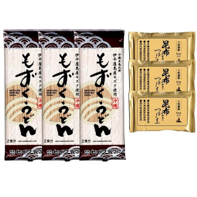【原材料・成分】 もずくうどん: 国産小麦粉、伊平屋産生もずく つゆの素: 有機しょうゆ(本醸造)、風味原料(こんぶ、かつおぶし、乾しいたけ)、砂糖、みりん、食塩、小麦発酵調味液、でん粉、酵母エキス、(原材料の一部に小麦、大豆を含む)