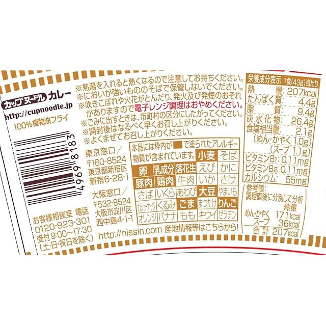 原材料:油揚げめん(小麦粉、植物油脂、食塩、糖類、醤油、ポークエキス、チキンエキス、たん白加水分解物)、フライドポテト、豚脂、味付豚肉、カレー粉、小麦粉、カレー調味料、野菜エキス、でん粉、玉ねぎ、人参、糖類、マーガリン、食塩、香味調味料、魚介エキス、ピーナッツバター、ねぎ、香味油、加工でん粉、調味料(アミノ酸等)、カラメル色素、炭酸Ca、増粘多糖類、かんすい、乳化剤、香料、酸味料、酸化防止剤(ビタミンE)、カロチノイド色素、香辛料抽出物、ビタミンB2、ビタミンB1、(原材料の一部に卵、乳成分、りんごを含む)