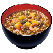 原材料:油揚げめん(小麦粉、植物油脂、食塩、チキンエキス、ポークエキス、しょうゆ、たん白加水分解物、香辛料)、かやく入りスープ(味付豚肉、味付豚ミンチ、味付卵、味付えび、糖類、粉末しょうゆ、食塩、ねぎ、香辛料、たん白加水分解物、香味調味料、ポークエキス、メンマパウダー)/加工でん粉、調味料(アミノ酸等)、炭酸Ca、かんすい、カラメル色素、増粘多糖類、カロチノイド色素、酸化防止剤(ビタミンE)、乳化剤、香辛料抽出物、香料、ビタミンB2、くん液、ビタミンB1、酸味料、(一部にえび・小麦・卵・乳成分・ごま・大豆・鶏肉・豚肉を含む)