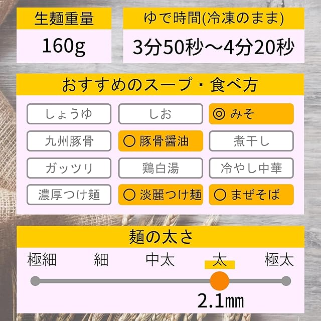 ?この麺におすすめの ラーメンスープ ・食べ方:○醤油ラーメン、○塩ラーメン、◎味噌ラーメン、○淡麗つけ麺、○まぜそば
