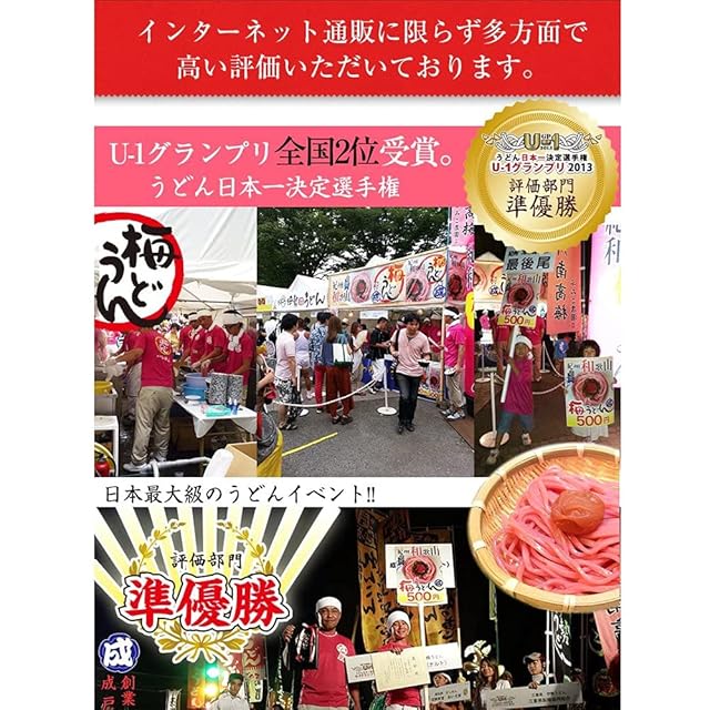昭和25年創業の成戸製麺所で安心の国内加工。成戸製麺所は国内、海外の有名店の麺も多数手掛けております。梅うどんはさぬきに負けない麺のコシ、のど越しのよいつるみが特徴です。