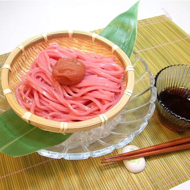 紀州南高梅の梅肉を練り込んだ香り高いピンク色のうどんを竹の丸ざるに大盛り150gと、専用のめんつゆ、南高梅をセットし、5食セットにしたボリューム満点!お中元に人気の夏ギフトです。