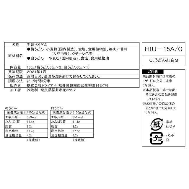 内容量:50g×11束(曲げ麺/白:50g×3束、梅:50g×3束 直麺/白:50g×5束)