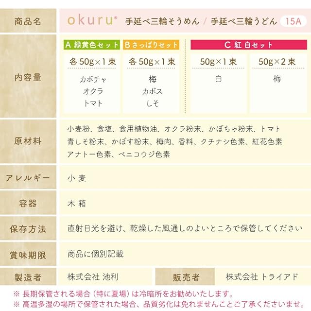内容量:50g×11個(おくら麺、かぼちゃ麺、青しそ麺、とまと麺、かぼす麺、梅麺、白麺)…約6人前