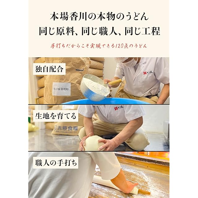 【香川屈指の人気店の味をご自宅で】2001年7月、香川県高松市香川町で本格手打もり家は創業しました。NHK「プロフェッショナル仕事の流儀」にも出演するなど、店主森田の手打ちうどんはあっという間に口コミで広がり、年間15万人ものお客様にご来店いただく「うどん県」香川屈指の人気店になりました。本格手打もり家で提供するうどんと「同じ職人が」「同じ原料を」「同じ工程で」手打ちした商品をお届けいたします。