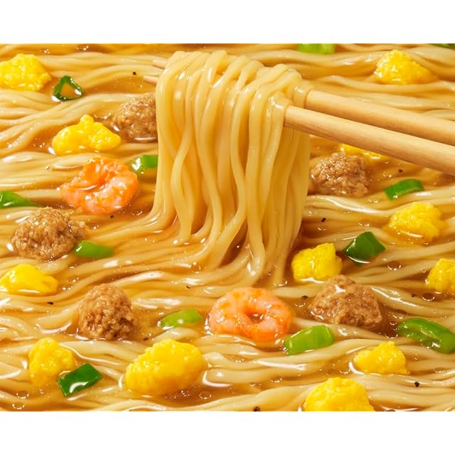 原材料:油揚げめん(小麦粉(国内製造)、植物油脂、精製ラード、でん粉、食塩、植物性たん白、砂糖、しょうゆ、チキンエキス、卵白)、添付調味料(粉末野菜、ポークエキス、魚介エキス、食塩、砂糖、チキンエキス、乳等を主要原料とする食品、香辛料、酵母エキス、魚醤(魚介類))、かやく(かに風かまぼこ、卵、貝柱風かまぼこ、ねぎ)/加工でん粉、調味料(アミノ酸等)、炭酸カルシウム、増粘多糖類、かんすい、クチナシ色素、酸化防止剤(ビタミンE、ローズマリー抽出物)、香料、ベニコウジ色素、カロチン色素、ビタミンB2、香辛料抽出物、パプリカ色素、ビタミンB1、(一部にえび・かに・小麦・卵・乳成分・いか・ごま・大豆・鶏肉・豚肉・ゼラチン・魚醤(魚介類)を含む)