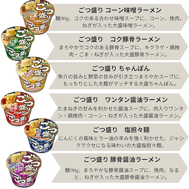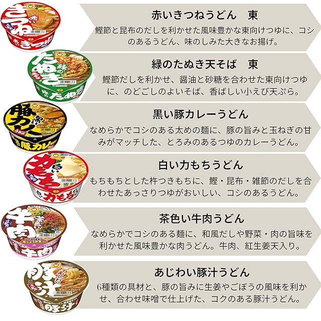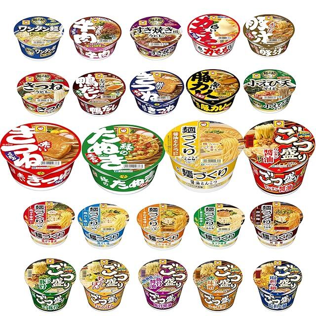 ? 24種類の内容 *マルちゃんの?づくりの人気の味6種類 ・?づくり 鶏ガラ醤油 ・?づくり 旨コク豚骨 ・?づくり 鶏だし塩 ・?づくり 担担麺 ・?づくり 醤油とんこつ ・?づくり 合わせ味噌 マルちゃんのごつ盛りの人気の味6種類 ・ごつ盛り ワンタン醤油ラーメン ・ごつ盛り 塩担々麺 ・ごつ盛り 豚骨醤油ラーメン ・ごつ盛り コーン味噌ラーメン ・ごつ盛り コク豚骨ラーメン ・ごつ盛り ちゃんぽん *和風?12種 ・ 赤いきつねうどん(東) ・ 白い力もちうどん ・ 黒い豚カレーうど ・ 緑のたぬき天そば(東) ・ 紺のきつねそば ・ おそば屋さんの鴨だしそば ・ 茶色い牛肉うどん ・ あじわい豚汁うどん ・ 麺之助 小えび天そば ・ 麺之助 すき焼き風うどん ・ 麺之助 きつねうどん ・ 麺之助 ワンタン麺 鶏だし塩そば