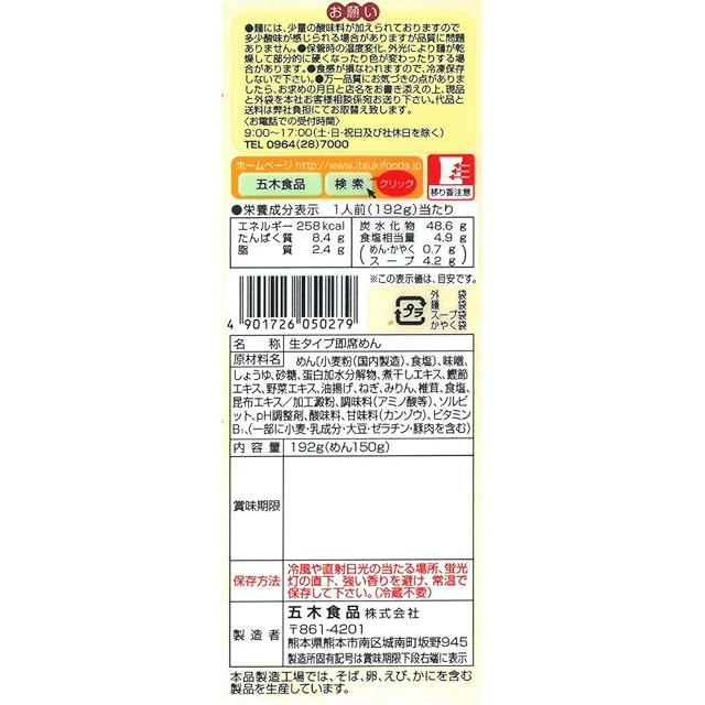 原材料:めん〔小麦粉(国内製造)、食塩〕、味噌、しょうゆ、砂糖、蛋白加水分解物、煮干しエキス、鰹節エキス、野菜エキス、油揚げ、ねぎ、みりん、椎茸、食塩、昆布エキス/加工澱粉、調味料(アミノ酸等)、ソルビット、pH調整剤、酸味料、甘味料(カンゾウ)、ビタミンB1、(一部に小麦・乳成分・大豆・ゼラチン・豚肉を含む)
