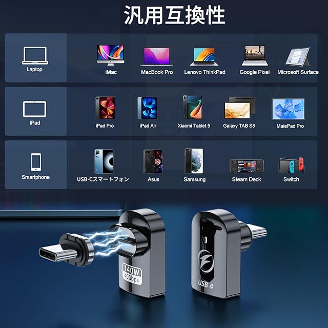 磁気設計、幅広い互換性: タイプc磁気アダプターは磁気接続を自動的に素早く簡単にサポートし、MacBook Proが落下するのを防ぎます。磁気アダプターは、MacBook Pro Mac Air、Chromebook、Dell XPS、Lenovo ThinkPad、Switch、Steam Deck、iPad Pro 2018-2020、iPad Air 2020、Samsung Galaxy Book、およびその他のタイプ c ポート デバイスと互換性があります。