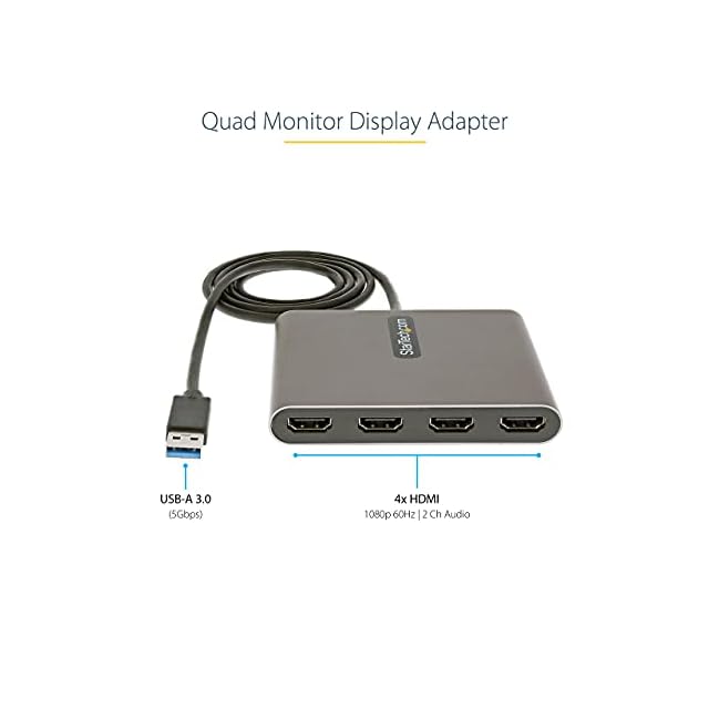 簡単セットアップ:1m一体型のUSB-Aケーブルを内蔵した4画面モニター対応USB-A - HDMIモニターアダプター。アダプターとホストデバイスの接続距離を柔軟に調整でき、複数のモニターを使用するワークスペースやHDTVを用いた会議室のセットアップに理想的