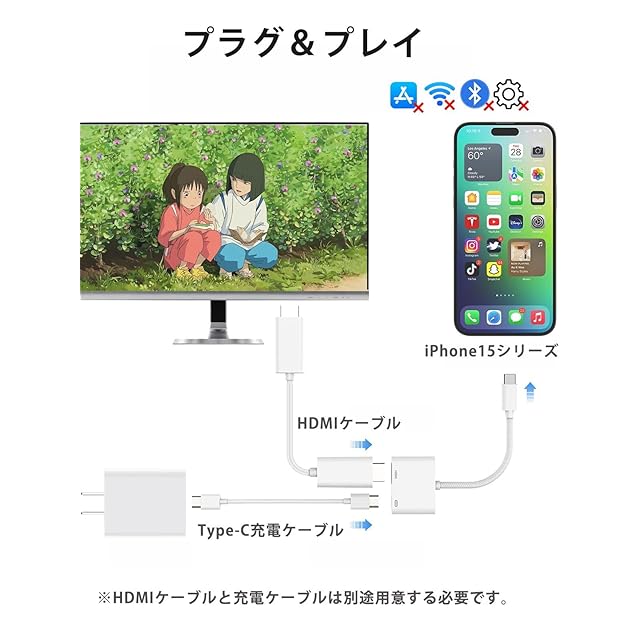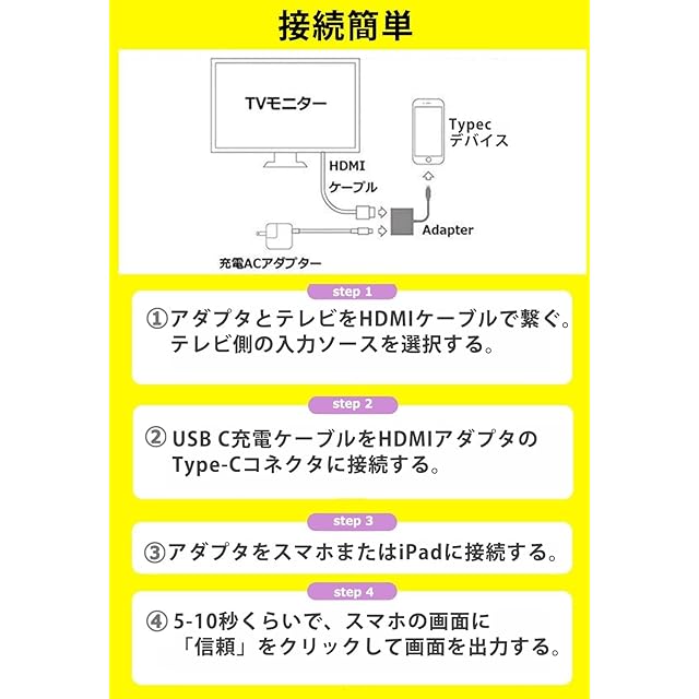 【操作簡単 - 設定不要】2024最新型hdmi type-c 変換アダプタにより、複雑な設定操作が不要、スマホへの給電も不要!!挿すだけですぐに携帯の画面をTVやプロジェクターなどの大画面に映します。ケーブルを接続した後、 スマフォン画面に表示された「信頼」をクリックすると、5秒~10秒のうちに自動的に接続完了となります。 アプリのダウンロードも必要ありません。