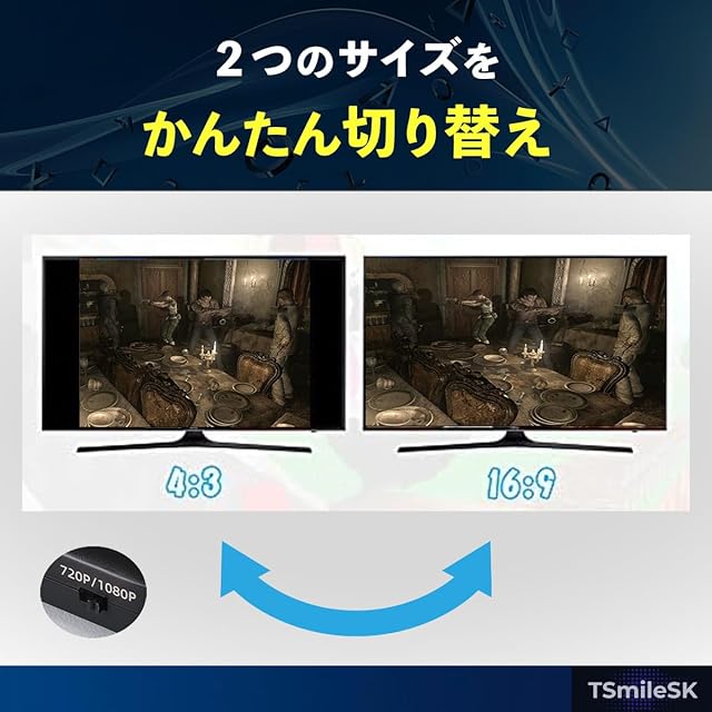 【かんたん切り替え】1080PのフルHD対応。現代のTVに合わせた16:9、昔の4:3の画面サイズとスイッチ1つで簡単に切り替えができます。