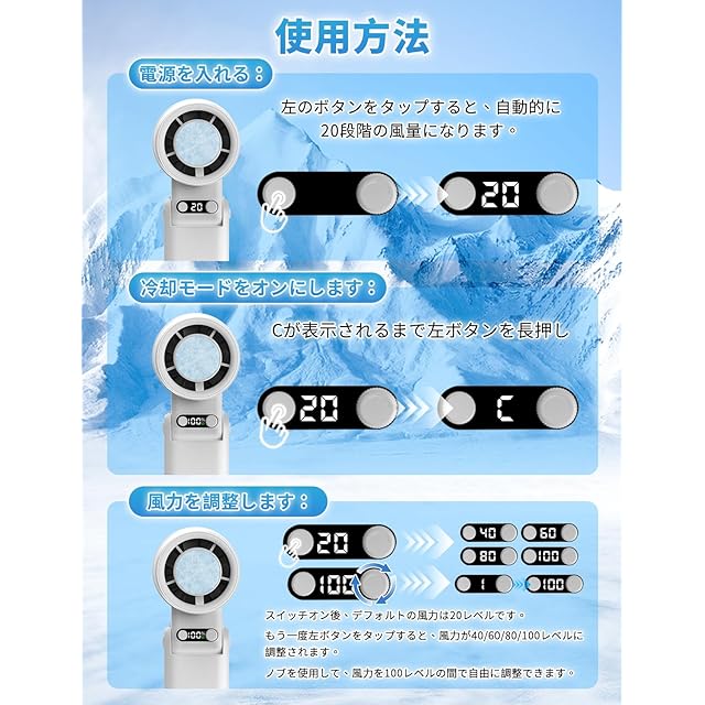 【大容量バッテリー・可視化ディスプレイ】本手持ち扇風機は、6,000mAhの大容量バッテリーを内蔵しており、フル充電の状態で最長20時間の連続使用が可能です。充電にはType-Cポートを採用しており(充電ケーブルはパッケージに同梱)、長時間の稼働を実現しながらも、わずか2時間でフル充電が完了します。外出先でのレジャーやお仕事の際も、バッテリー切れの心配がなく、効率的な充電により時間も大幅に節約できます。また、本体正面には液晶ディスプレイを搭載しており、1〜100段階の風量調節や冷却チップのオン・オフ状態をひと目で確認することができます。扇風機 ハンディの使用状況が一目瞭然で、より快適にご利用いただけます。