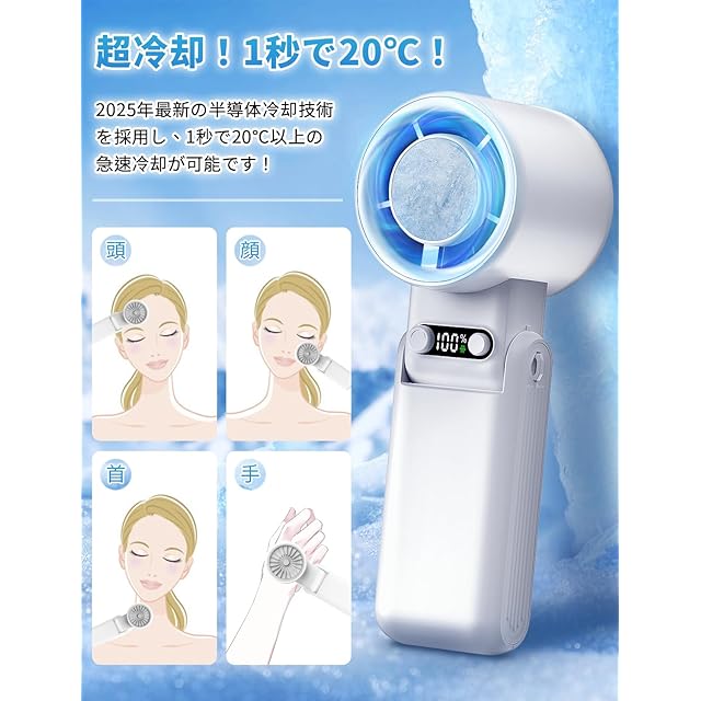 【冷却プレート・気温転換】こちらのハンディファンには、2025年夏に新たに開発された最新の半導体冷却チップが搭載されております。風量調節ボタンを長押しするだけで冷却モードが起動し、小範囲に低温エリアを形成します。熱風を涼しい冷風へと変換することができ、炎天下の屋外でも自分専用のエアコンのように快適にお過ごしいただけます。さらに、冷却チップを肌に直接当てることで、ピンポイントでの冷却が可能です。手首や首筋など血流の多い部位に当てることで、上昇した体温を素早く下げることができ、熱中症のリスクを大幅に軽減いたします。