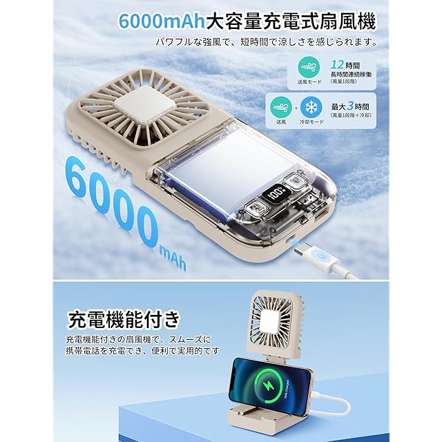 【6000mAh 大容量】6000mAh の大容量バッテリーを搭載しており、充電後数時間もの長時間の稼働が可能です。アウトドアピクニックや音楽フェス、長距離旅行など、電源を頻繁に探すことなく、1 回の充電で快適な涼しさを常に伴い、充電不安を完全に解消します。