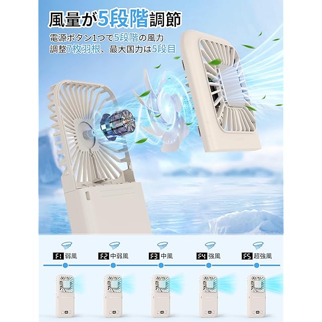 【5段の風速調整】5 段の風速設定があり、静かな微風から強力な大風まで、お昼寝、仕事、アウトドアなど様々なシーンに合わせて自由に切り替えられ、ニーズに正確に対応します。1 段は浅眠に適し、2 段は仕事や勉強に助力、3 段は読書や雑談に快適、4 段は暑さを速やかに追い払い、5 段は酷熱時に爽快感をもたらします。