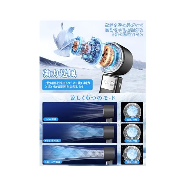 【199段階自由調節・7枚羽根】このハンディファンにも使われる超高速回転モーターと。1-199段階風量調節により、自然に近い優しい風からパワフルな超強風まで細かく切り替えることが可能。この卓上扇風機は強力なモーターを備えたタービン構造を採用し、吸い込んだ熱気を急速に圧縮して冷却し、冷風に変えて吹き出します。流体力学原理に基づいた循環ファンデザインを採用し、一般的な3枚羽根の手持ち扇風機と比べより穏やかなバワフル風量を送ることが可能です。冷却機能と併用するとさらに涼しく、汗による不快感を爽やかに変えて、暑苦しい夏でも快適に過ごせます。
