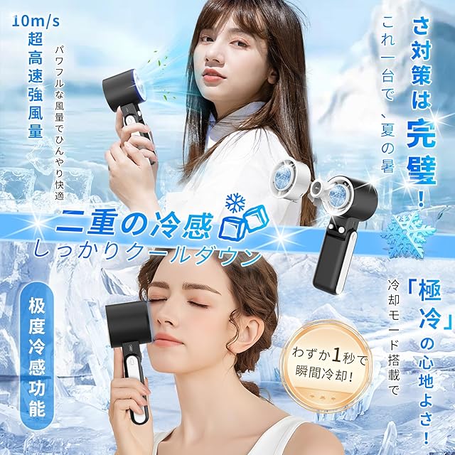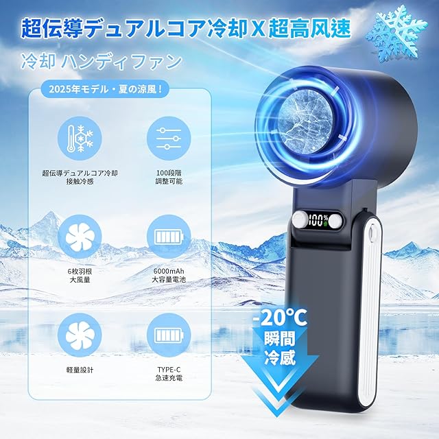 【超導双核冷却技術で瞬間冷却 -20°C】本製品には、2025年夏に登場した最新の超導体双核冷却チップが搭載されており。1秒冷感機能で、風量ボタンを長押しするだけで簡単に冷却機能を起動できます。 冷風エリアを局所的に作り出すことで、暑い屋外でもまるで個人用エアコンのような涼しさを実感できます。さらに、冷却面を直接肌に触れさせることで、ピンポイントでの冷却が可能です。特に手首や首元など、体温調節に効果的な部位に当てることで、体の熱を効率よく逃がし、熱中症対策としても大変有効です。