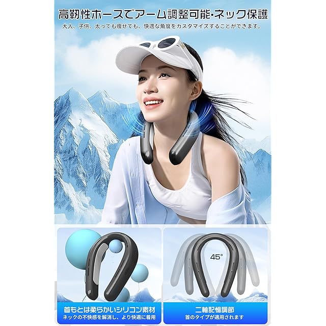 【アーム調整可能&羽根なし安心設計】この冷却ファン首は人間工学に基づいた首の弧のデザイン、中央部分は柔らかいシリコン素材で作られており、首の形状に合わせて調整でき、自然なフィット感を向上させ、小柄な方から大柄な方まで、あらゆる体型に対応します。大人、子供、太っても痩せても、快適な角度をカスタマイズすることができます。長時間の着用でも疲れにくくになります。首掛けクーラーは羽根なしとミニチュア排風口設計で、髪を巻き込まずに、異物を挟み込む事もご心配ありません。指が入る隙間がなく、事故を防ぐことができます。子供・大人にも安心してお使いいただけます。安全で快適な使用が可能、プレゼントに絶対喜ばれる夏ギフト!