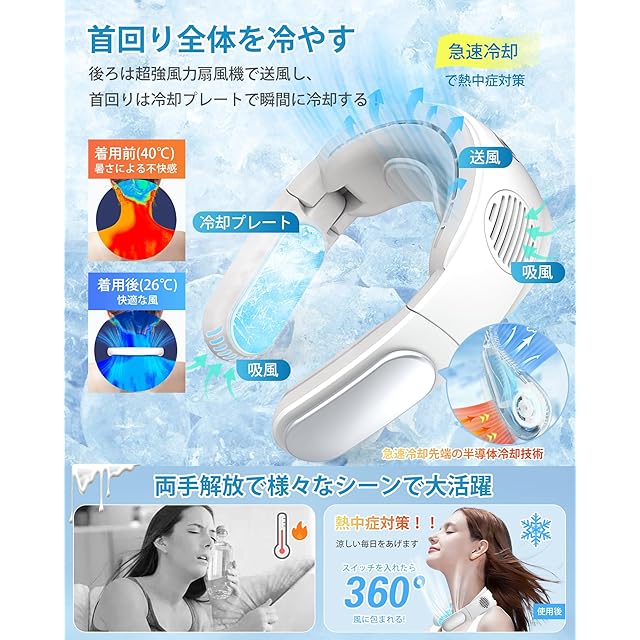 【3D上下送風&3段階風量調節】ネックファンの風と冷却プレートが首元に接触することで、首元は周囲温度より-15℃のひんやりと冷たくが感じ、猛暑の中でも快適に過ごせます。このネッククーラーは3段階自由調節できます、ボタンを押すと、風量は強・中・弱の3段階と冷却は弱冷・中冷・強冷の3階段を切り替えることが可能です。 首周りに沿うように装着するネックバンドタイプの携帯扇風機なので、送風口が汗をかきやすい首まわりや顔まわりに効率よく送風できるため、涼しさを感じやすくて、360°の立体風でこれまでにない冷却体験を与えます。