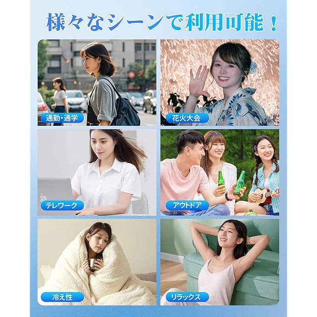 【1台でどんなシーンも快適に!あなたの生活を全方位サポート】ネッククーラーは両手を使わずに清涼感を楽しめます。エアコンかけない室内で使用はもちろん、アウトドアで携帯扇風機としても大活躍!サイズがコンパクトでバッグに入れて持ち運びも便利です。「つけているのを忘れるほど自然な快適さ」が、あらゆるシーンであなたをサポート。季節を問わず、いつでもどこでも、あなただけの心地よさを実現します。