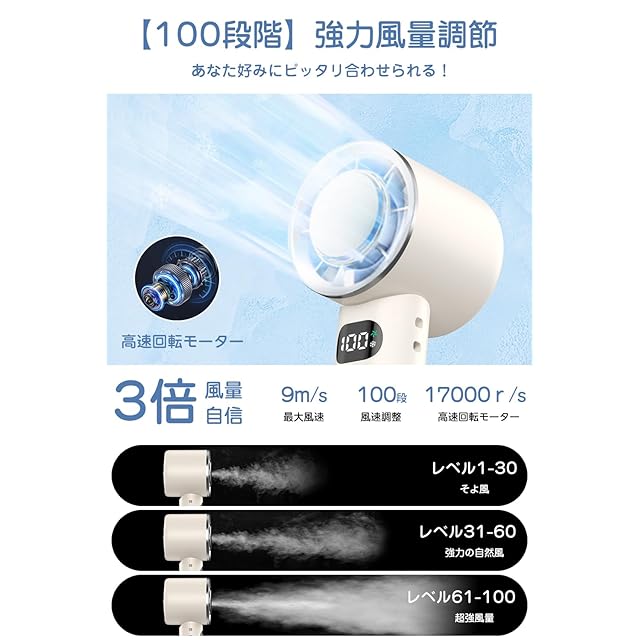 ✅【100段階風量調整&LEDディスプレイで風力管理】 このハンディファンは、100段階の風量調整機能を搭載しており、自分の好みに合わせた風量を細かく調節できます。特に、デザイン性と機能性を両立したLEDディスプレイで、風量のレベルやバッテリー残量を一目で確認でき、外出先でも便利に使用できます。携帯扇風機ならではの便利さで、風の強さやバッテリーの状態をリアルタイムでチェックできるのは、大きな利点なミニファンです。