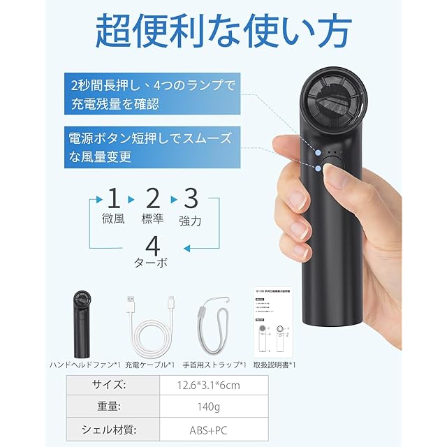 【4段階風量切替】手持ち扇風機は弱・中・強・超強の4段階の風量調節機能が搭載、風量切替ボタンを押すたびに、自然に近い優しい風からパワフルな風まできめ細かく風量を調節することが可能。室内ハンディファンでは1~3段目の自然風と微風と弱風モードで優しく自然風を再現し、超静音で職場や図書館でも快適に過ごせます。夏場の野外では4段目の超強風でパワフル送風し、猛暑でもより爽やかな涼感をもたらします。